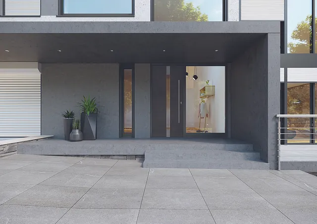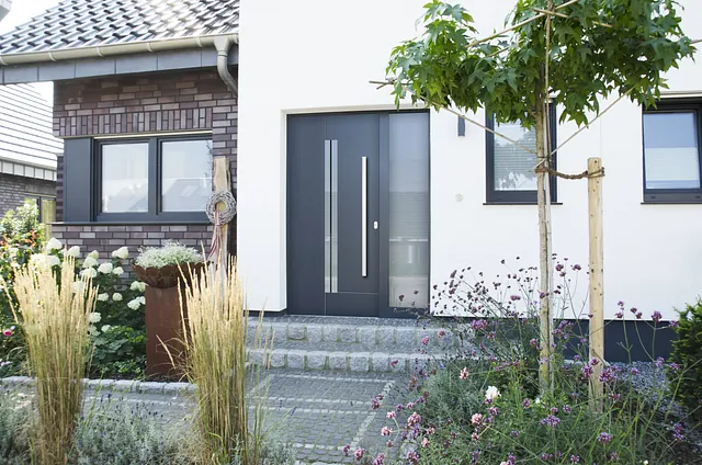 Der Türrahmen und Türflügel setzen sich aus einem Mehrkammerprofil mit einem Stahlkern zusammen und besitzt moderne Abdichtung-Systeme.